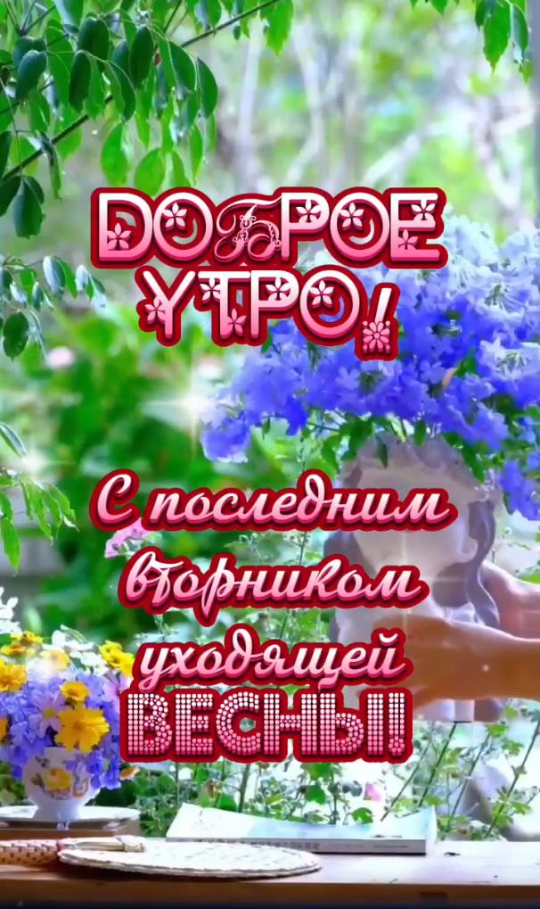 Вот и уходит весна…. Мая последние дни…. Мы собрали для вас самые красивые открытки с пожеланиями и поздравлениями с последним Вторником Мая, а значит и этой прекрасной Весны! Доброе утро, друзья! Встречаем последний вторник МАЯ! Скачивайте картинки и поздравляйте друзей и подруг!
